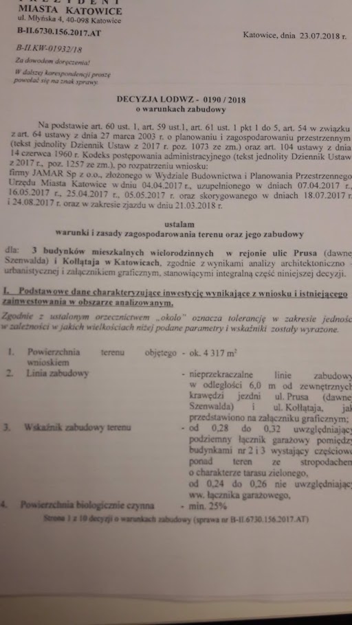 Skandaliczna wręcz decyzja Miasta pozwala Firmie Jamar sp. z oo wybudować w środku dzielnicy willowej trzy potężne 16 mieszkaniowe, 3 kondygnacyjne bloki – o łącznej ilości 48 mieszkań – jakieś 150 osób oraz około 80 samochodów. Tyle ile łącznie mieści się na wszystkich pobliskich ulicach – Olszynowej, Kołątaja, Nad Jarem, Grzybowej czy tej części Prusa.