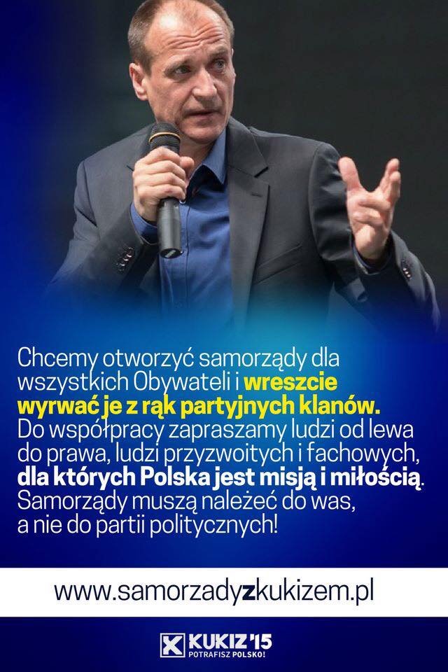 Kukiz 15 od lat walczy z dojeniem Państwa przez Partie Polityczne i ogólnie z Partiokracją. Czym jest ta Partiokracja? – to system który decyduje kto i gdzie ma być Naszym reprezentantem  i jak ten reprezentant ma mówić i głosować  – jeśli tak to po co głosować na 460 posłów jak można na 5 ba 10 przywódców partyjnych. Wszyscy by zaoszczędzili. Teraz Wielkie Partie chcą by ten system zawitał do samorządów. Nie ludzie są  dla nich ważni – nie lokalne sprawy i nie lokalni społecznicy ale interesy Partii. Nie jak będzie się samorządzić tylko Która Partia przejmie Teren. Czy utrzymają się POgrobowcy a może do gmin wjedzie walec z „Dobrą Zmianą” tworząc całkowicie centralne zarządzanie. „Czy chcemy takich samorządów, które będą wojowały, warczały na rząd? Czy chcemy takich, które będą współpracować? – pytał na ostatniej konwencji prezes PiS ”