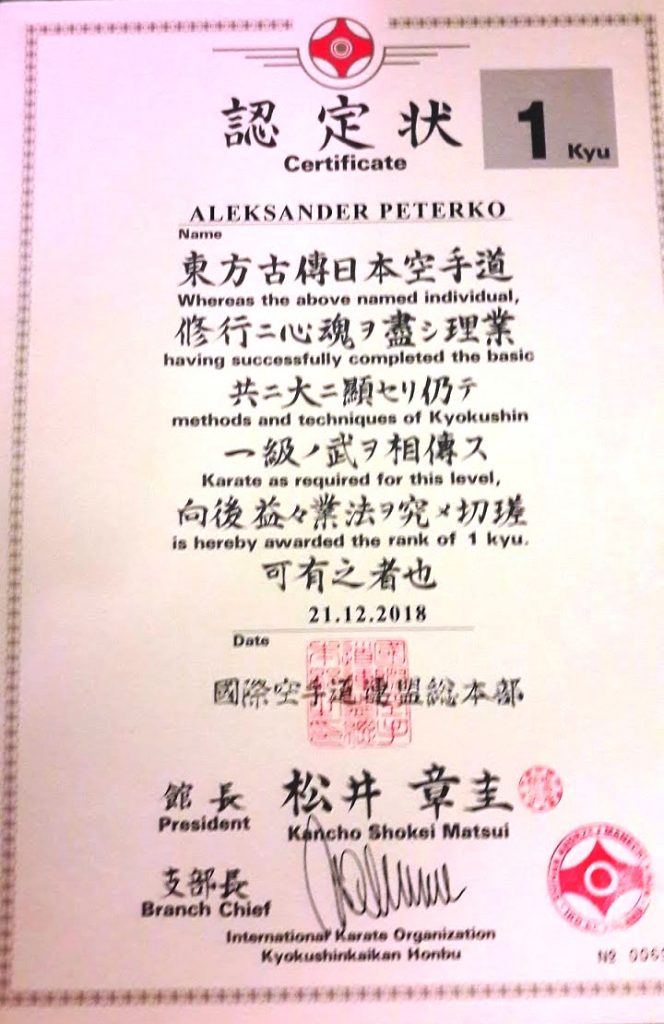 Wczoraj w Siemianowicach otrzymałem po treningu z rąk Branch Chief shihana A. Maneckiego 5 DAN  certyfikat 1 kyu ze zdanego egzaminu zimowego. 😉